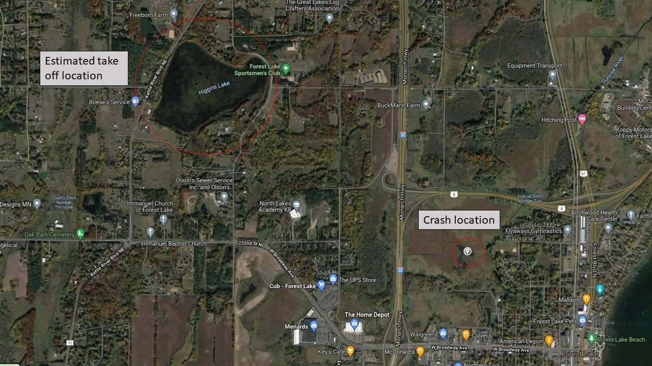 Map of Forest Lake, Minnesota showing estimated take off location and estimated location of crash.