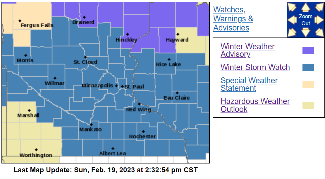 A WINTER STORM WATCH was issued for the entire Twin Cities region for heavy snow and blizzard conditions with wind gusts as high as 45 mph being possible.