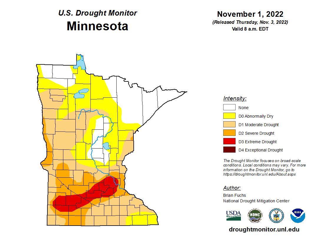 With a large portion of the Twin Cities region under Severe to Extreme drought, which you can see from the map above, the rain over the last few days is a site for sore eyes for many. According to the National Weather Service Twin Cities/Chanhassen, Minnesota climate report issued early Wednesday morning, the Twin Cities saw around 0.64 inches of rain so far this month, with 0.31 inches of that falling yesterday, November 8th. Since September 1st, the Twin Cities region has seen 1.12 inches, which is about 4.94 inches below the normal amount of rain we should be seeing this time of year. The normal amount is supposed to be around 6.06 inches.