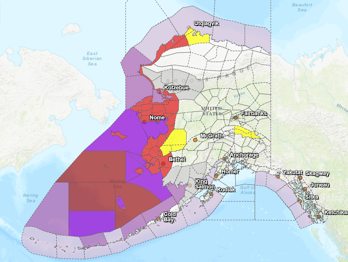 Map from the National Weather Service of the weather alerts in place from the remnants of Typhoon Merbok.